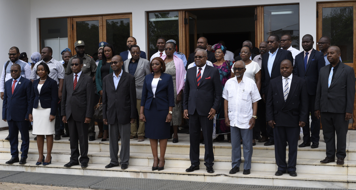 Em primeiro plano, da esquerda para direita, Francisco Mucanheia, Conselheiro do Presidente da República; Alda Moaine Varela, Directora-Geral adjunta do IPHLLN; Tobias Dai e Feliciano Gundana, combatentes da Luta de Libertação Nacional; Josefina Mpelo, Ministra dos Combatentes; António Hama Thay e Mariano Matsinha, combatentes da Luta de Libertação Nacional; Bernardo Nakatembo, Director-Geral do IPHLLN. Em segundo plano, da direita para a esquerda, Guilherme Ombe, pesquisador e docente universitário; Luis Quimo, pesquisador o IPHLLN; Carlos Lwanga, Marina Pachinuapa, Joaquina Simati, Teresa Thembo, Carlos Siliya, combatentes da Luta da Libertação Nacional. À direita está Pedro Guiliche, cientista político e docente universitário. |